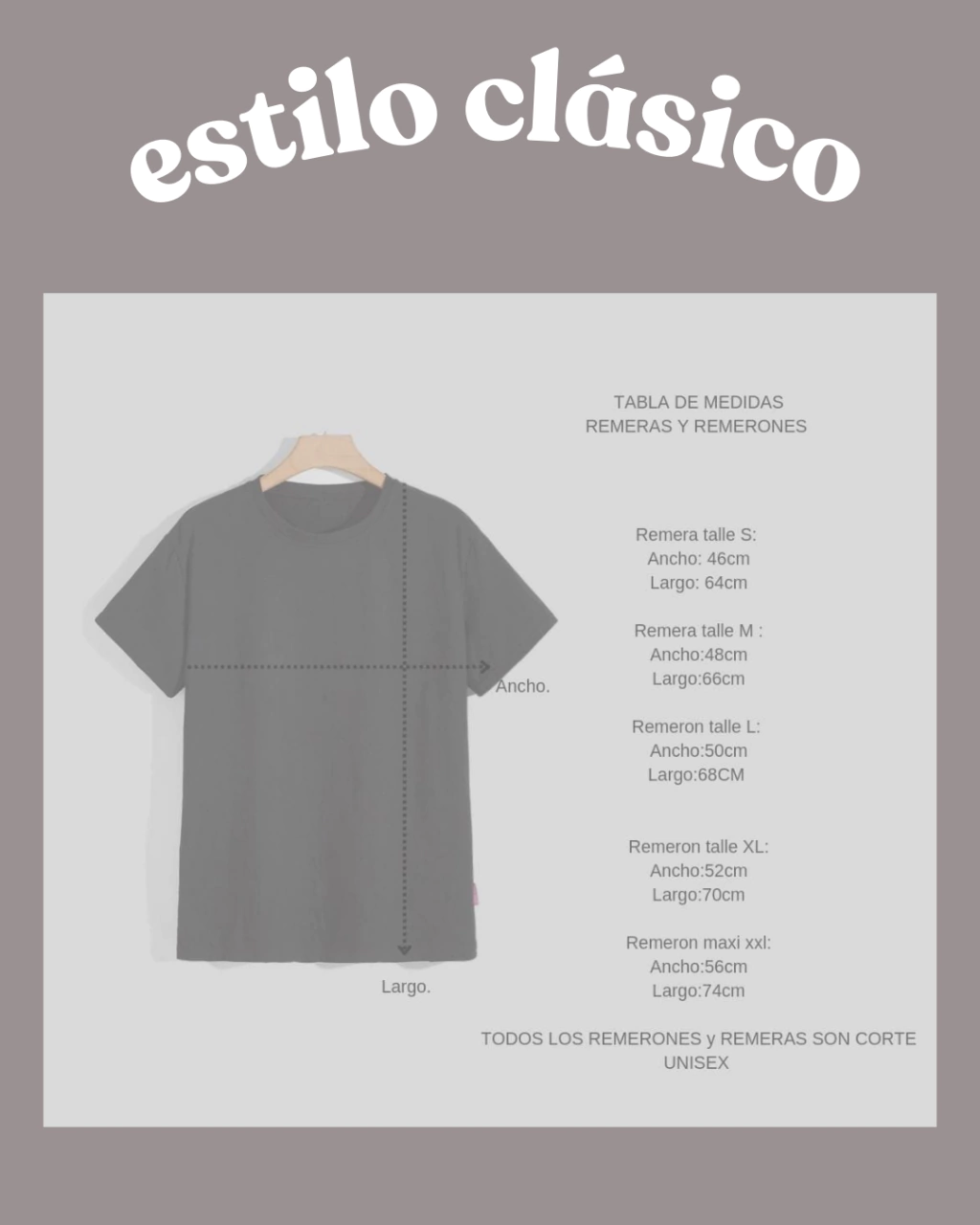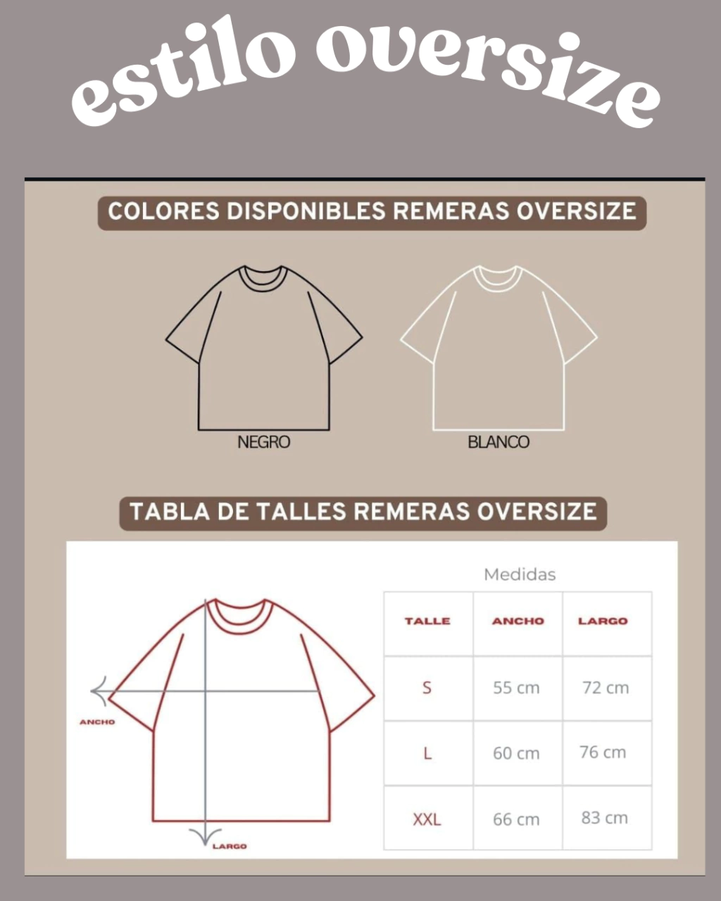 Verificar bien los talles publicados para comparar medidas entre el estilo clasico y oversize, no cualquier duda podes escribirme por privado (Mail o Whatsapp) para aclararlas.